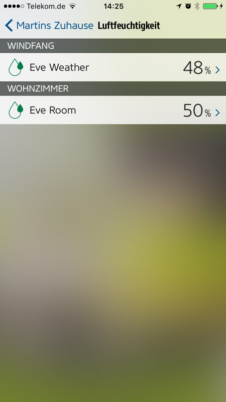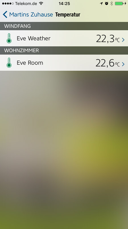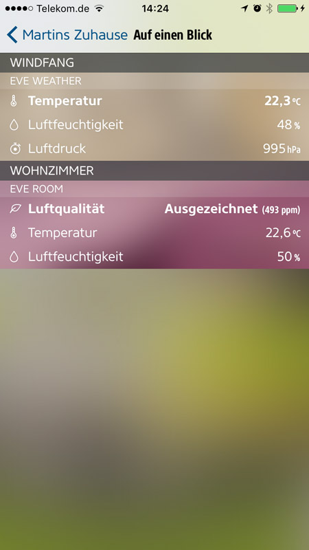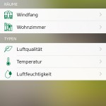 Die Eve-App ist insgesamt übersichtlich aufgebaut. Alle eingerichteten Räume werden in der Übersicht angezeigt und ermöglichen einen Blick auf die im jeweiligen Raum gemessenen Werte. Der Raumsensor „room“ misst neben der Temperatur, die Luftfeuchtigkeit und die Luftqualität. Der Außensensor misst ebenfalls die Temperatur und Luftfeuchtigkeit, statt der Luftqualität kann der Außensensor den Luftdruck messen.