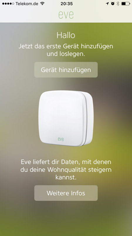 Man legt zunächst die Batterien in den Sensor ein, startet die App und kann direkt das erste Gerät hinzufügen. Das Gerät wird sehr schnell gefunden und kann dann ausgewählt werden (z.B. „Eve room“). Nun muss der HomeKit Einrichtungscode abfotografiert werden, der auf dem Gerät aufgedruckt ist bzw. sich auf einem Kärtchen im Karton des Sensors befindet. Der Code wird über die Kamera des iPhones problemlos erkannt und für die Einrichtung übernommen.