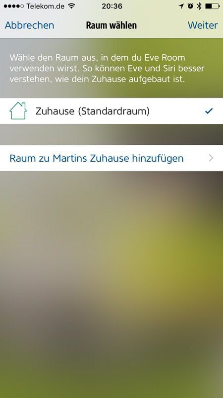 Nachdem das Gerät mit dem iPhone gekoppelt ist, muss der Sensor einem „Raum“ zugewiesen werden. Entweder übernimmt man einfach die Voreinstellung „Zuhause – Standardraum“ oder man legt selbst einen neuen Raum wie „Arbeitszimmer“ an (verschiedene Räume auswählbar). An dieser Stelle ist die richtige Zuordnung von Sensor zu Raum wichtig, da man die gemessene Temperatur später auch per Siri Spracheingabe abfragen kann – z.B. über die Frage an Siri „Wie warm ist es im Arbeitszimmer?“. Nachdem der Raum zugewiesen wurde ist der Sensor fertig eingerichtet und liefert nach einigen Minuten erste Messwerte.