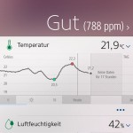Neben der Raumansicht bietet die App zusätzlich eine Übersicht nach Messungs-Typen, d.h. die einzelnen Werte der Sensoren werden zusammengefasst in „Luftqualität“, „Temperatur“ und „Luftfeuchtigkeit“. So kann z.B. die aktuelle Temperatur aller Sensoren in einer Übersicht angezeigt werden. Der Verlauf der Messwerte kann zusätzlich in einem Diagramm angezeigt werden, was im Vergleich zur Darstellung in der Netatmo-App aber aus unserer Sicht weniger übersichtlich ist. Einzelne Messpunkte lassen sich im Diagramm nicht auswählen, so dass man nur einen relativ groben Überblick über die Werte im zeitlichen Verlauf bekommt. Es gibt jedoch eine zusätzliche Listenansicht der einzelnen Messungen.