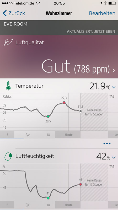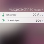 Durch die HomeKit-Integration kann man mit Hilfe der Sprachsteuerung (Siri) des iPhones die aktuelle Temperatur und die Luftfeuchtigkeit in den Räumen abfragen (weitere Werte sollen später ebenfalls abgefragt werden können). In unseren Tests hat die Frage „Wie warm ist es im Wohnzimmer?“ oder „Wie ist die Temperatur im Wohnzimmer?“ meistens zu einem Ergebnis geführt, manchmal jedoch nicht, da Siri keine Antwort vom angefragten Gerät bekommen hat. Warum es in diesen Fällen nicht geklappt hat, erfährt man leider auch hier nicht.