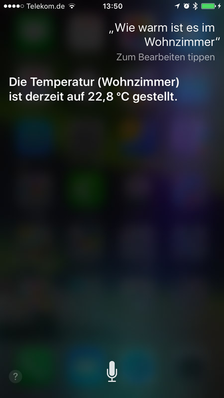 Wenn es klappt, lautet die Antwort von Siri z.B. „Die Temperatur (Wohnzimmer) ist derzeit auf 22,8°C gestellt.“, was in diesem Fall natürlich nicht ganz korrekt formuliert, aber trotzdem verständlich ist.