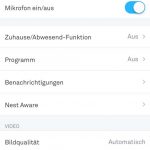 Die App verfügt über eine An- und Abwesenheitserkennung (Lokalisierung des Smartphones), so dass die Kamera auf Wunsch deaktiviert werden kann, wenn man zu Hause ist. Das Verhalten der Kamera bei An- und Abwesenheit lässt sich für alle verbundenen Nest Kameras einstellen. Man könnte also einzelne Kameras deaktivieren wenn man zu Hause ist und eine weitere Kamera aktiviert lassen.