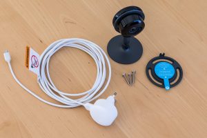 Im Lieferumfang der Kamera befindet sich neben dem USB-Netzteil ein 3 Meter langes Anschlusskabel, das eine recht flexible Platzierung der Kamera ermöglicht. Die Kamera muss über das Kabel mit Strom versorgt werden, es gibt also keinen POE-Netzwerk-Anschluss (Power over Ethernet) oder integrierten Akku. Die Montage der Kamera kann über eine ebenfalls mitgelieferte Montageplatte direkt an der Wand erfolgen (Schrauben oder Magnet) oder sie kann einfach auf einen Schrank gestellt werden – der Aufnahmewinkel der Kamera kann durch ein Gelenk nach vorne oder hinten geneigt werden. Das Design der Kamera gefällt uns gut – schlicht und modern. Die Verarbeitung macht ebenfalls einen sehr ordentlichen Eindruck, insbesondere der magnetische Standfuß und das Gelenk des Gehäuses wirken sehr robust (Metall).