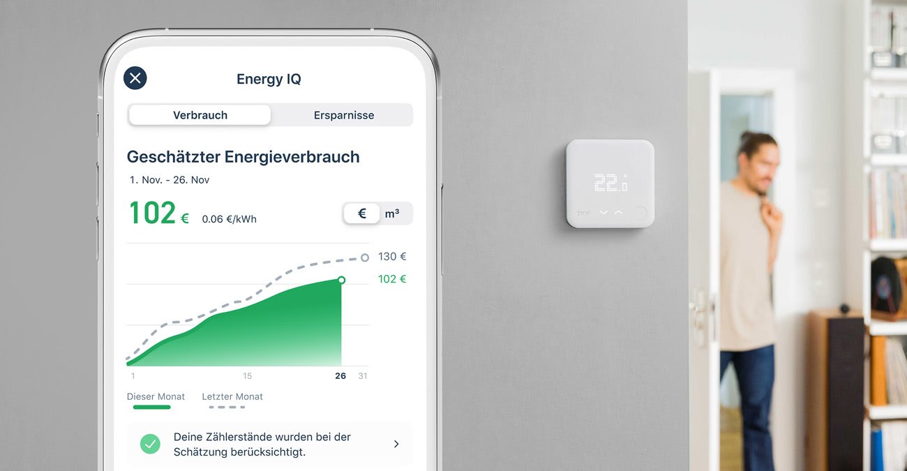 Die Tado-App wird für die Funktion mit Daten des Strom- oder Gaszählers gefüttert, zusätzlich werden Daten wie die Temperatur und die Einstellungen in der App für die Prognose berücksichtigt. Auf Basis der eingespeisten Daten zeigt Tado eine Kostenvorhersage für den aktuellen Monat an.