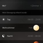 Zusammengefasst kann mit Hilfe des Hue Sensors eine einstellbare Lichtszene eingechaltet werden, wenn eine Bewegung festgestellt wurde. Dazu können zwei Zeiträume definiert werden, für die jeweils eine Lichtszene gewählt werden kann. So kann man zum Beispiel tagsüber abhängig vom vorhandenen Umgebungslicht (zwischen 08:00 bis 23:00 Uhr in der Standard-Einstellung) eine Szene aktivieren lassen, Nachts (23:00 bis 08:00 Uhr) dann eine andere Szene – z.B. die Szene „Nachtlicht“, damit man in der Nacht nicht geblendet wird. Die Uhrzeiten sind dabei einstellbar, es können jedoch neben den vorhandenen Zeiträumen für „Tag“ und „Nacht“ nicht weitere Zeiträume hinzugefügt werden.