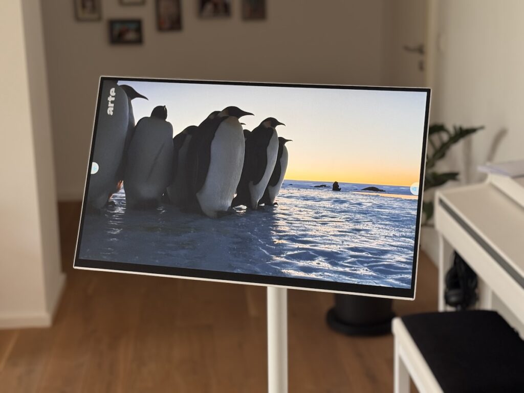 Im Standfuß sitzt ein 10.000-mAh-Akku, der in der Praxis rund 4–5 Stunden durchhält. Alternativ könnt Ihr den smarten Fernseher natürlich auch dauerhaft an einer Steckdose betreiben. Wichtig zu wissen: Das Display lässt sich nicht abnehmen und als klassisches Tablet verwenden – es benötigt zwingend die Stromversorgung über den Standfuß.